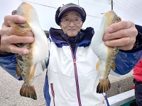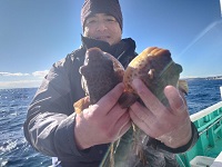 今日の感想 朝の内は、港前北目18m付近の未知の場所探索して見たら、1人の御客様が、ヒガン(アカメ)フグを2匹連続釣り揚げて、まだ時間早いはずが、暗闇から、釣れました。7時半頃、大原沖15mの港前に入り、ヒガン(アカメ)フグを狙って見ましたが、5匹、3匹釣れた人も、居ましたが、始めて釣りして、釣果よりも、デカイサイズ釣って満足な人有ったり、船酔いの道具だせなかった人、水際落ちた人、上げたら居た人などの状況でしたが、次第に、北西風強くなり、余り動けない中、釣れれば良型なので、大流しして、海悪い釣り難い中、1匹ずつ貯めていきました。良型ヒガン(アカメ)フグが、1匹、2匹と釣れたら、ショウサイフグ、コモンフグよりも、何倍も、1匹の値段&価値あるので、満足の嬉しいお土産です。
